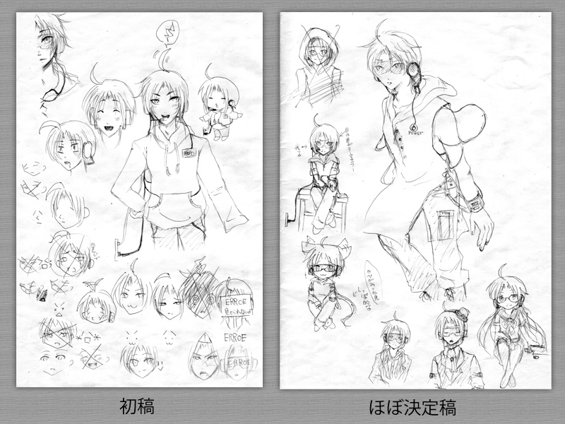 そして何パターンか考えた後、ほぼ現在の形に。ちゃっかり女装バージョンも考えてました。フードを脱いでいる=ディスクトップの外枠を外したというイメージ、コードは電源コード等、アームカバーはusbhubと言った感じでデザインしました。
