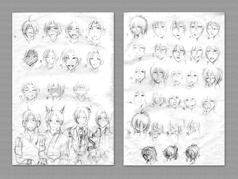一段落ついた所に第一の難関、表情決めです。失礼ながら辞書ファイルを覗かせていただき、各表情3つ程ずつ特徴的な台詞を表に→使われている時の雰囲気を簡単な一言に→表情を描いてみてそれを台詞と合わせて違和感がないかチェックという工程で決定しました。
