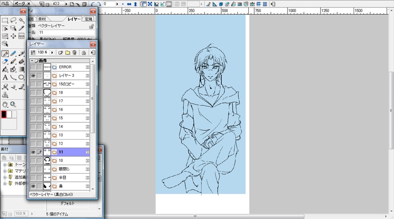 その後psdで書き出しコミスタで線画を描いて行きます。ベースとなる物を描いてコピペのち改変の繰り返しです。