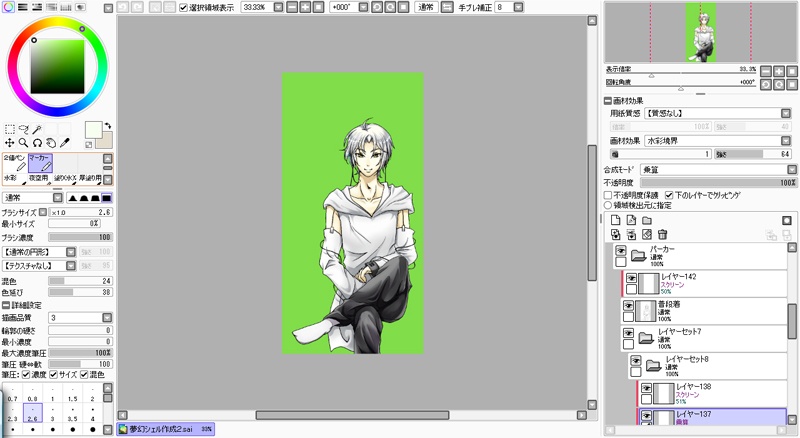 線画が完成したらいよいよ色塗り(SAIを使用)です。私のやり方だとフォルダとクリッピング機能を使いまくるのでレイヤ数が半端ない事に。その為、ムサ君はファイル一つで足りますがみずば君はファイルが三つ必要になります。