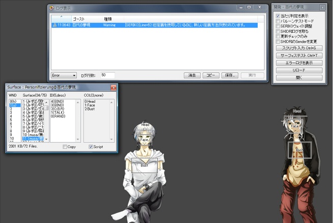 私は【作ったシェルに変更】部分で挫折しかかりました。エラーが多すぎて表示できない(実際は英語)のポップアップが出て強制終了。色々試しまくった結果、原因は着せ替えの触り判定。旧仕様でシェルのスクリプトを書いたのが原因(旧仕様は着せ替えの触り判定に対応していない)だったようです。表情や着せ替えがズレて表示されるのは画像ファイルのタイトルが「surface0」「surface10」を少し変えた(「surface0x」など)だけの物を使用している場合に起きているバグ(本体はずれている自覚なしなのでエラー表示もされず)だと見つけるのにも一苦労しました。