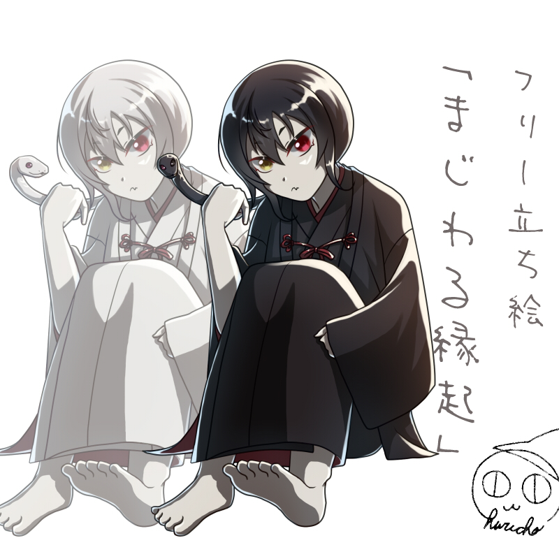 オッドアイの和服の子ども。少年かもしれないし少女かもしれない。髪が蛇なのか、肩に蛇が乗ってるだけか。黒蛇がベースですが、白蛇差分もあります。