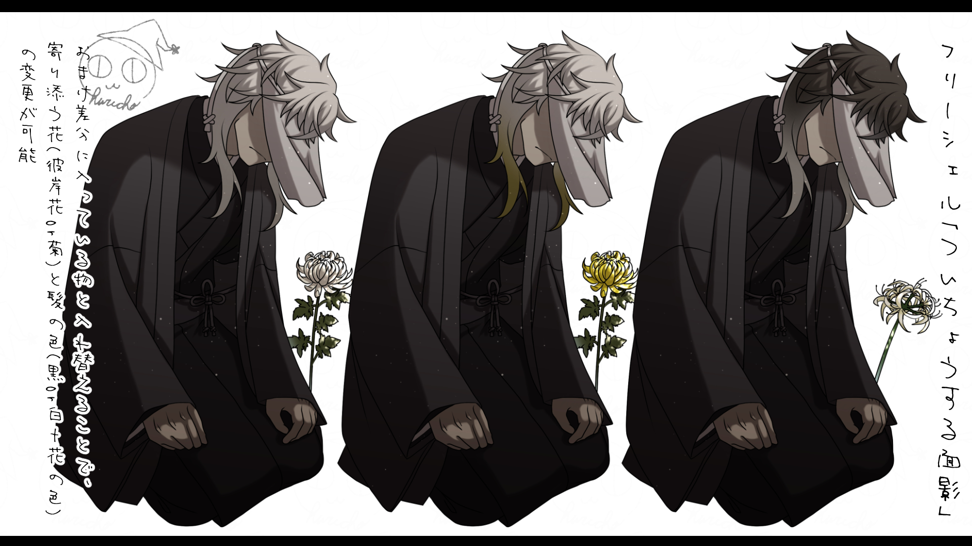 おまけ差分に入っている物と入れ替えることで、寄り添う花(彼岸花or菊)と髪の色(黒or白+花の色)の変更が可能