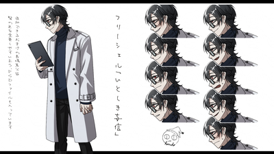 タブレット端末を持ってる眼鏡をした人。コートを白衣と言い張れるかもしれないし、目にハイライト無いけどデートかもしれない。